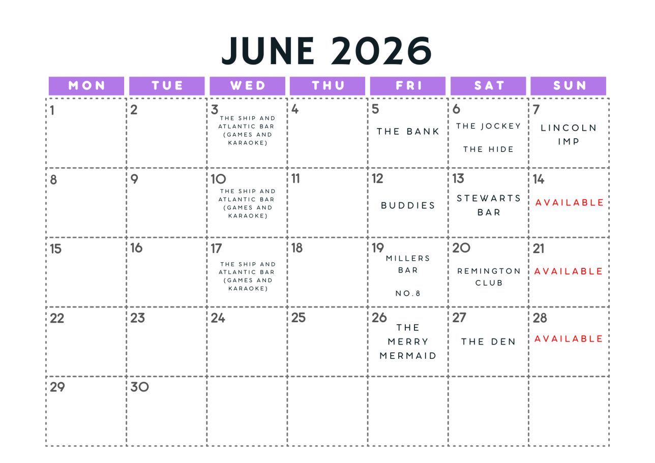 Fri 5 Jun – The Bank Sat 6 Jun – The Hide Sat 6 Jun – The Jockey Sun 7 Jun – Lincoln IMP Fri 12 Jun – Buddies Bar & Grill Sat 13 Jun – Stewarts Bar Fri 19 Jun – Millers Bar Fri 19 Jun – No8 Sat 20 June - Remington Club Fri 26 Jun – Merry Mermaid Sat 27 Jun – The Den