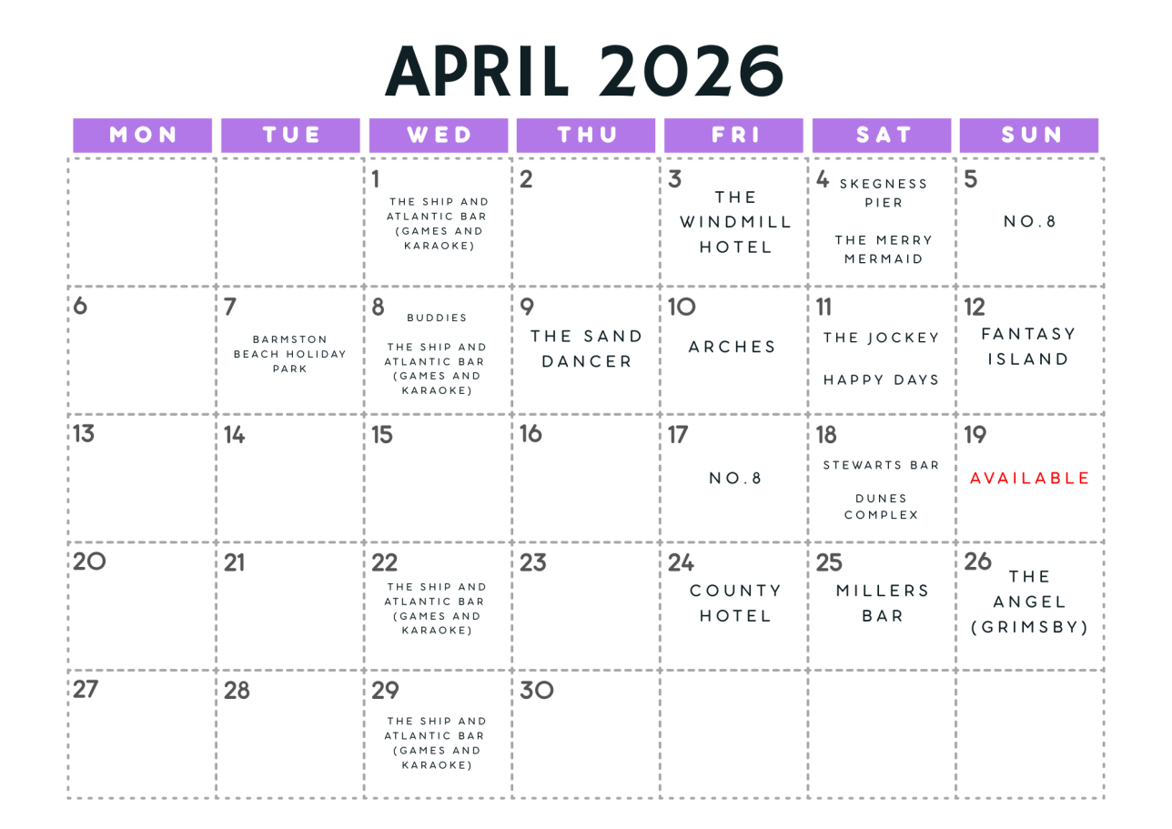 Fri 3 Apr – The Windmill Hotel Sat 4 Apr – Skegness Pier Sat 4 Apr – Merry Mermaid Sun 5 Apr – No8 Tue 7 Apr - Barmston Beach Holiday Park Wed 8 Apr – Buddies Thu 9 Apr – The Sand Dancer Fri 10 Apr – Arches Sat 11 Apr – The Jockey Bar & Grill Sat 11 Apr – Happy Days Sun 12 Apr – Fantasy Island Fri 17 Apr – No8 Sat 18 Apr – Dunes Complex (Mablethorpe) Sat 18 Apr – Stewarts Bar Fri 24 Apr – County Hotel (Grimsby) Sat 25 Apr – Millers Bar Sun 26 Apr – The Angel (Grimsby)