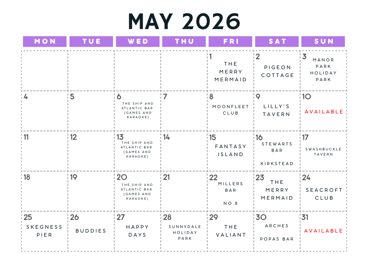 Fri 1 May – Merry Mermaid Sat 2 May – Pigeon Cottage Sun 3 May – Manor Park Fri 8 May – Moonfleet Club Sat 9 May – Lilly's Tavern Fri 15 May – Fantasy Island Sat 16 May – Stewarts Bar Sat 16 May – Kirkstead (Sutton) Sun 17 May – Swashbuckle Tavern Fri 22 May – No8 Fri 22 May – Millers Bar Sat 23 May – Merry Mermaid Sun 24 May – Seacroft Club (Trusthorpe) Mon 25 May - Skegness Pier Tue 26 May – Buddies Bar Wed 27 May – Happy Days Thu 28 May - Sunnydale Holiday Park Fri 29 May – The Valiant Sat 30 May – Arches Sat 30 May – Popas Bar