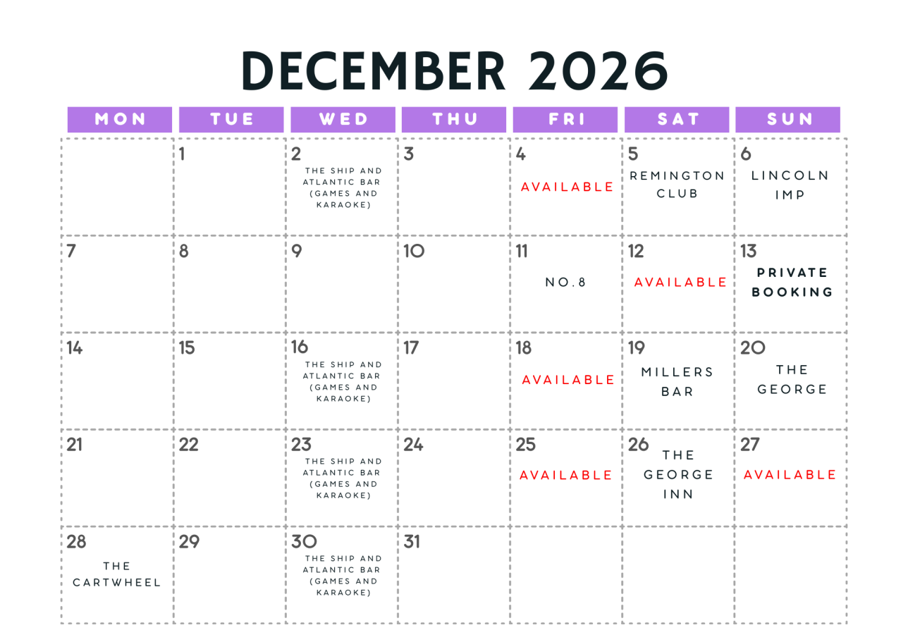 Sat 5 Dec - Remington Club Sun 6 Dec – Lincoln IMP Fri 11 Dec – No8 Sat 19 Dec – Millers Bar Sun 20 Dec – The George (Market Rasen) Sat 26 Dec – George Inn Mon 28 Dec - The Cartwheel