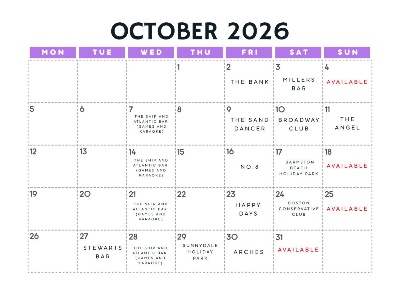 Fri 2 Oct – The Bank Sat 3 Oct – Millers Bar Fri 9 Oct – The Sand Dancer Sat 10 Oct – Broadway Club (Peterborough) Sun 11 Oct – The Angel Fri 16 Oct – No8 Sat 17 Oct – Barmston Beach Holiday Park Fri 23 Oct – Happy Days Sat 24 Oct – Boston Conservative Club Tue 27 Oct – Stewarts Bar Thu 29 Oct - Sunnydale Holiday Park Fri 30 Oct – Arches