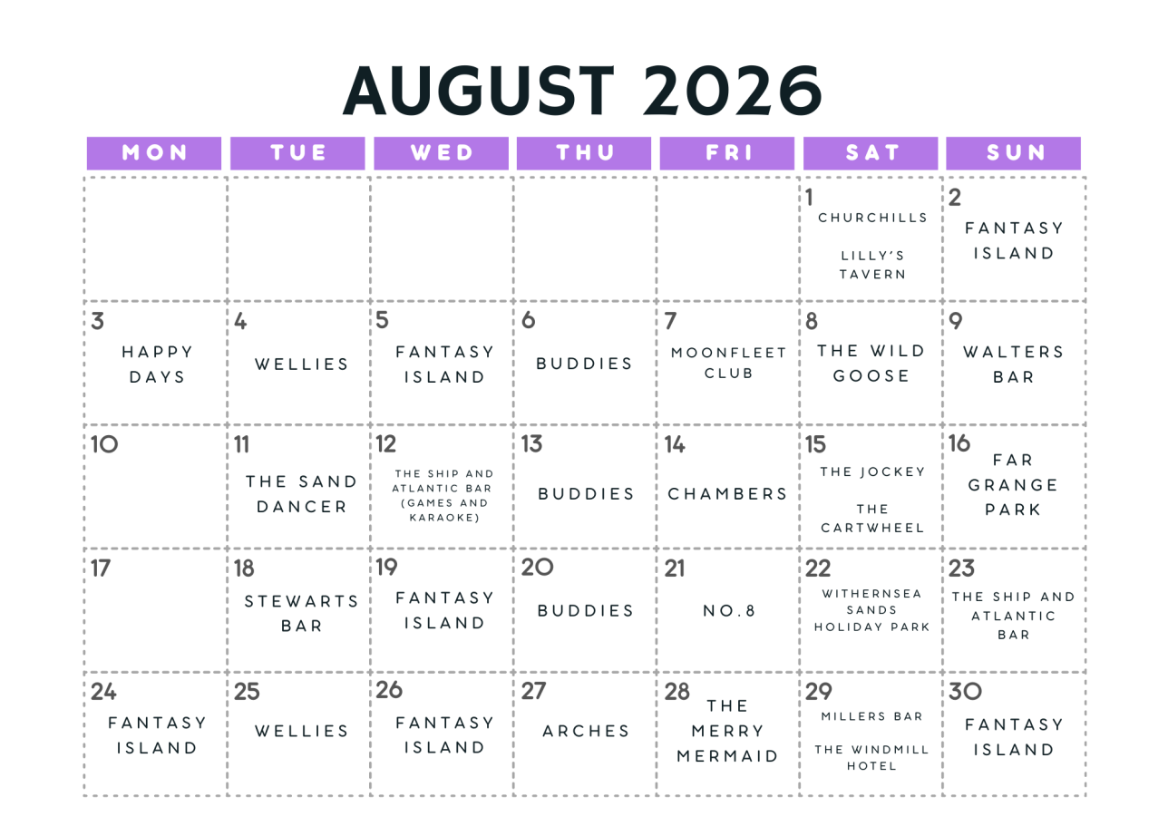 Sat 1 Aug – The Oasis (Ingoldmells) Sat 1 Aug – Churchills (Skegness) Sun 2 Aug – Fantasy Island Mon 3 Aug – Happy Days Tue 4 Aug – Wellies Wed 5 Aug – Fantasy – Pyramid Thu 6 Aug – Buddies Bar & Grill Fri 7 Aug – Moonfleet Club Sat 8 Aug – The Wild Goose (Mablethorpe) Sun 9 Aug – Walters Bar Tue 11 Aug – The Sand Dancer Thu 13 Aug – Buddies Bar & Grill Fri 14 Aug – Chambers – Grimsby Sat 15 Aug – The Cartwheel Sat 15 Aug – The Jockey Sun 16 Aug - Far Grange Holiday Park Tue 18 Aug – Stewarts Bar Wed 19 Aug - Fantasy Island Thu 20 Aug – Buddies Bar & Grill Fri 21 Aug - The No.8 Sat 22 Aug – Withernsea Holiday Park Sun 23 Aug – The Ship & Atlantic Bar Mon 24 Aug – Fantasy Island Tue 25 Aug – Wellies Wed 26 Aug – Fantasy – Pyramid Thu 27 Aug – Arches Fri 28 Aug – Merry Mermaid Sat 29 Aug – Millers Bar Sat 29 Aug – The Windmill Hotel Sun 30 Aug – Fantasy Island
