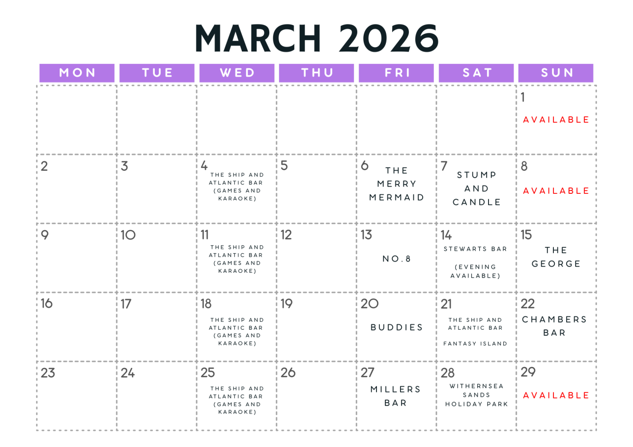 Fri 20 Mar – Buddies Bar Sat 21 Mar – Fantasy Island Sat 21 Mar – The Ship & Atlantic Bar Sun 22 Mar – Chambers – Grimsby Fri 27 Mar – Millers Bar Sat 28 Mar – Withernsea Sands