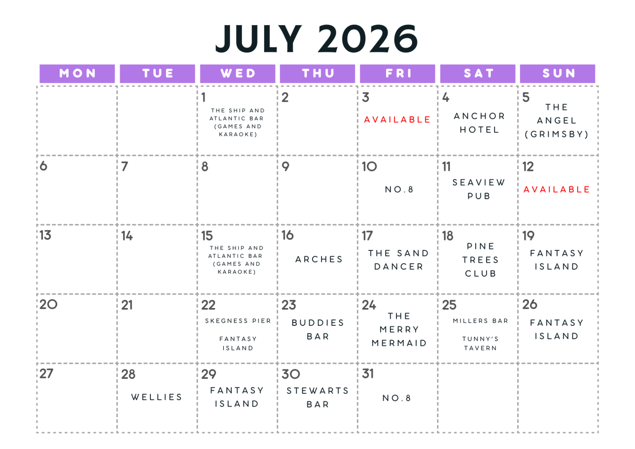 Sat 4 Jul – Anchor Hotel Ingoldmells Sun 5 Jul – The Angel (Grimsby) Fri 10 Jul - The No.8 Sat 11 Jul - Seaview Pub Thu 16 Jul – Arches Fri 17 Jul – The Sand Dancer Sat 18 Jul - Pine Trees Club Sun 19 Jul – Fantasy Island Wed 22 Jul - Skegness Pier Wed 22 Jul – Fantasy – Pyramid Thu 23 Jul – Buddies Bar & Grill Fri 24 Jul - Merry Mermaid Sat 25 Jul – Millers Bar Sat 25 Jul – Tunny's Tavern Sun 26 Jul - Fantasy Island Tue 28 Jul – Wellies Wed 29 Jul – Fantasy – Pyramid Thu 30 Jul - Stewarts Bar Fri 31 Jul – No8