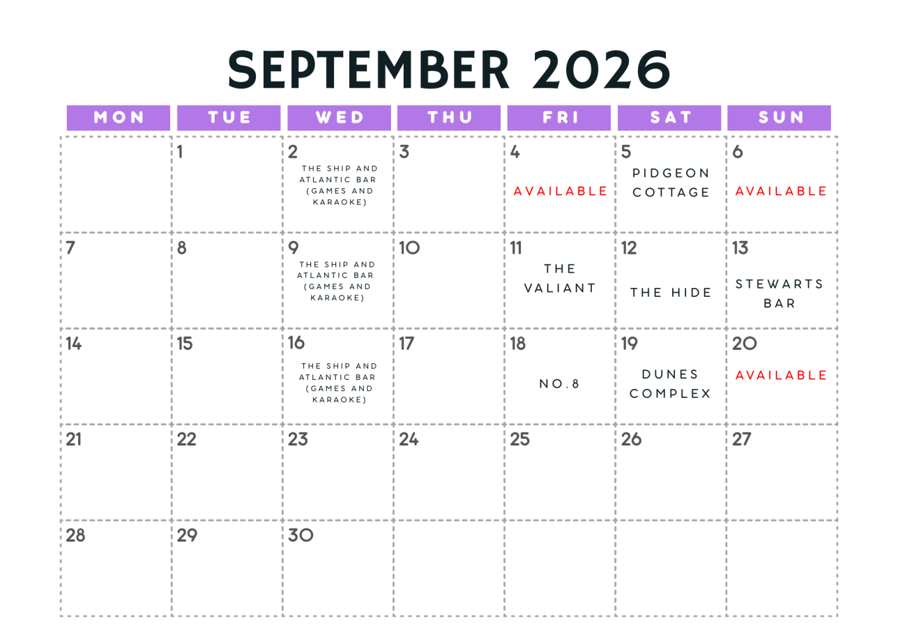 Sat 5 Sep – Pigeon Cottage Fri 11 Sep – The Valiant Sat 12 Sep – The Hide Sun 13 Sep – Stewarts Bar Fri 18 Sep – No8 Sat 19 Sep – Dunes Complex